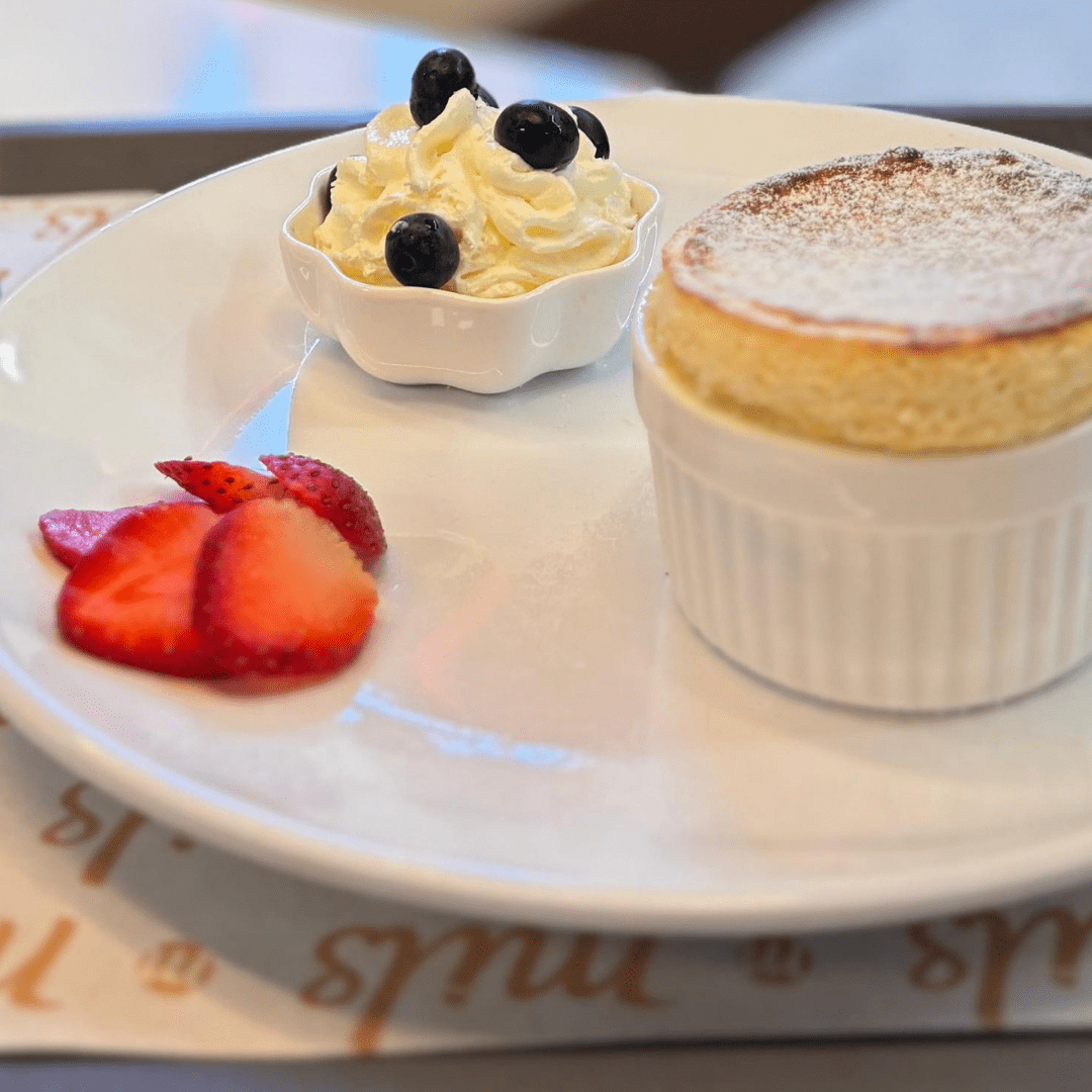 Impossible to resist, a fluffy, airy, delicate Japanese pancake served with maple syrup and whipped cream