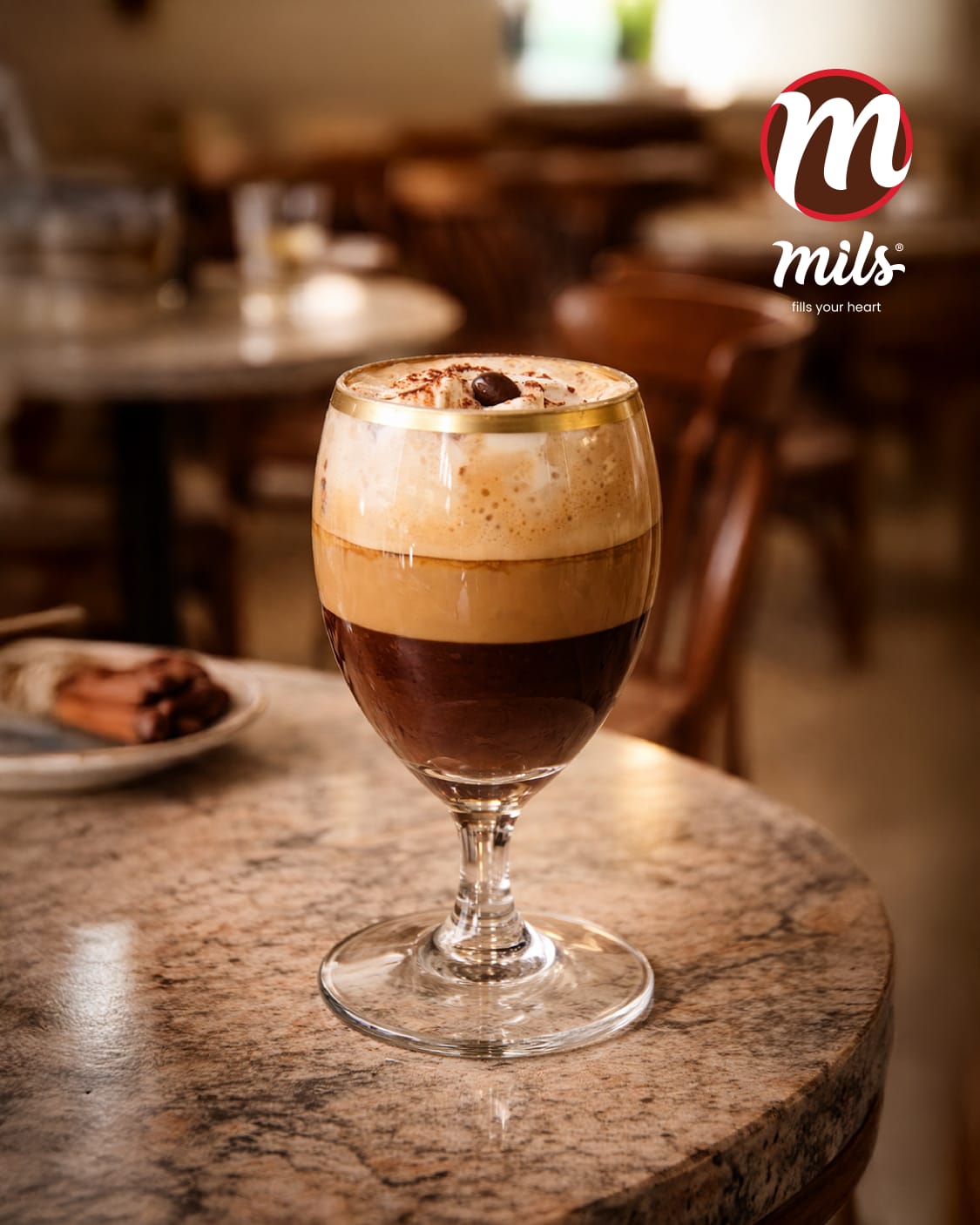 A classic layered drink from Turin, combining rich espresso, velvety hot chocolate, and softly whipped cream.