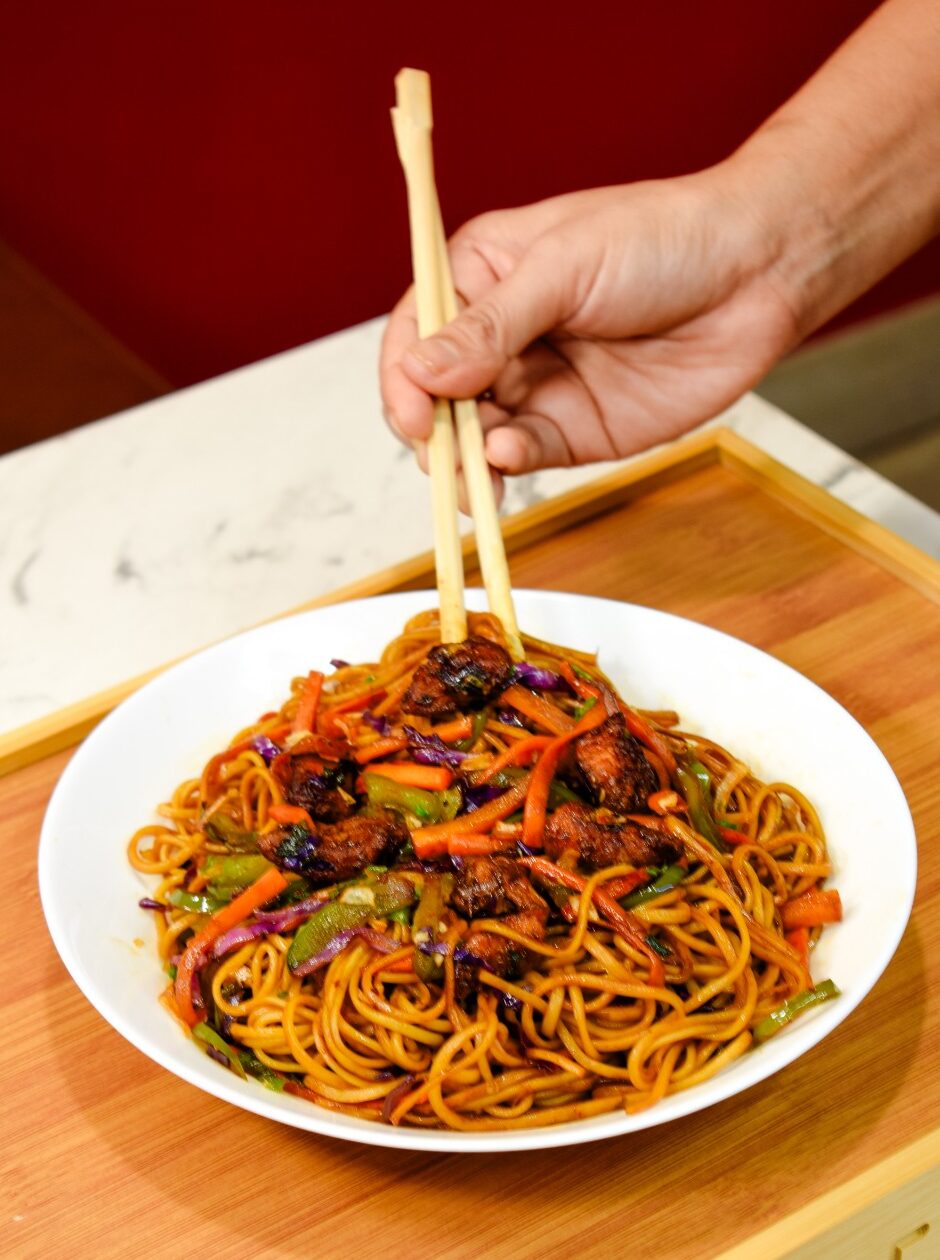Stir-fried Malaysian mi goreng noodles tossed with tender chicken and fresh vegetables in a rich, flavorful sauce.