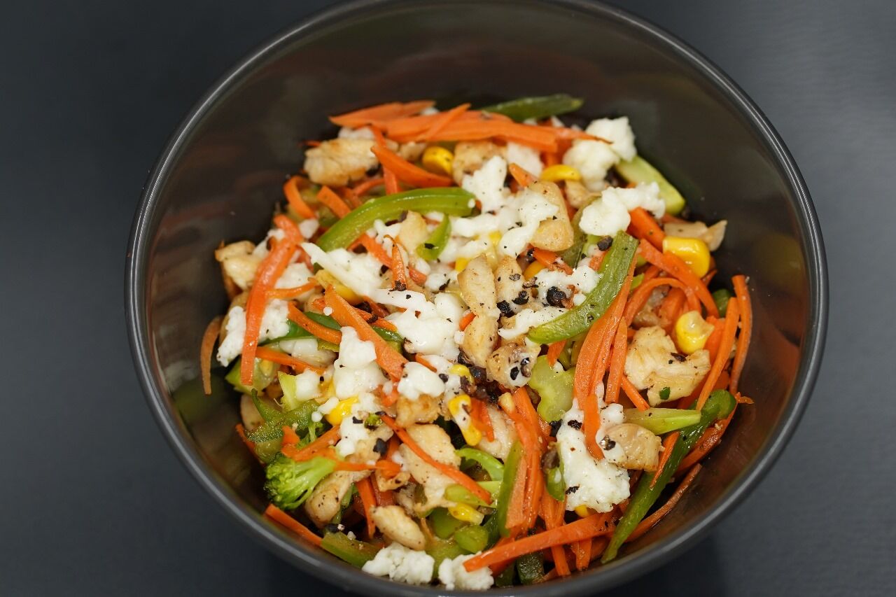 Energetic salad mix of sauteed vegtables and juicy fresh chicken breast pieces
