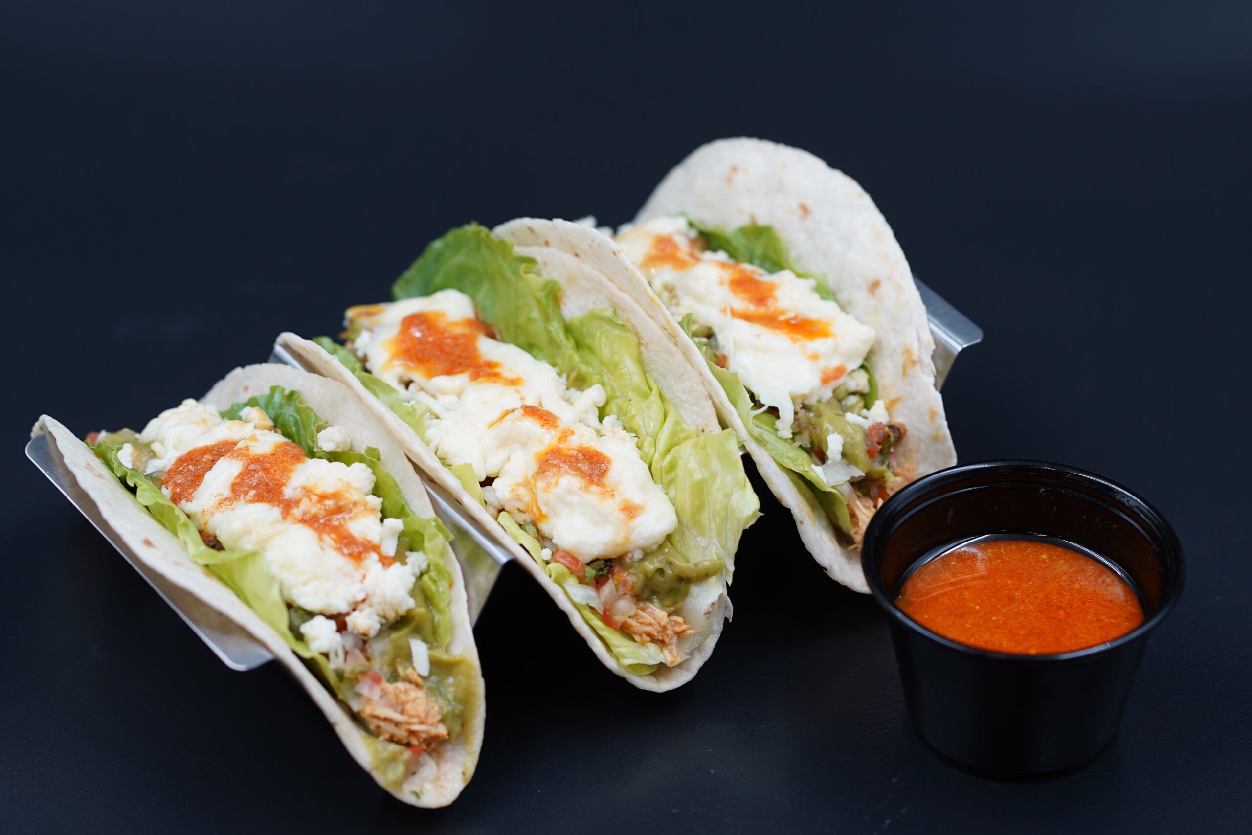 a must try speciality mexican dish; crispy taco sheet filled with our speciality milsChicken shredded to blend with a mexican salsa, Pico de Gallo mix and shredded cheese placed on a milsChicken curry infused taco corn sheet